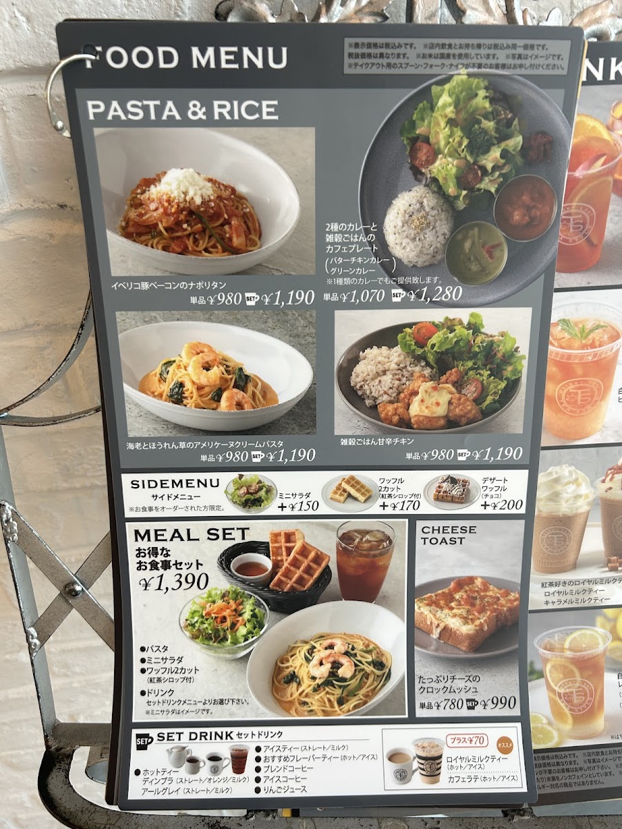 Among the highlights is the 手作りチョコレートクリームサンド (Chocolate Cream Sandwich), perfect for takeaway at just ¥269. For a heartier option, try the プレーンワッフル&ロイヤルミルクティーセット (Plain Waffle & Royal Milk Tea Set) for ¥590, providing an indulgent treat to complement your tea. Don’t miss the unique 黒糖きなこミルクティー (Brown Sugar Soy Milk Tea) at ¥410, a must-try for tea lovers.